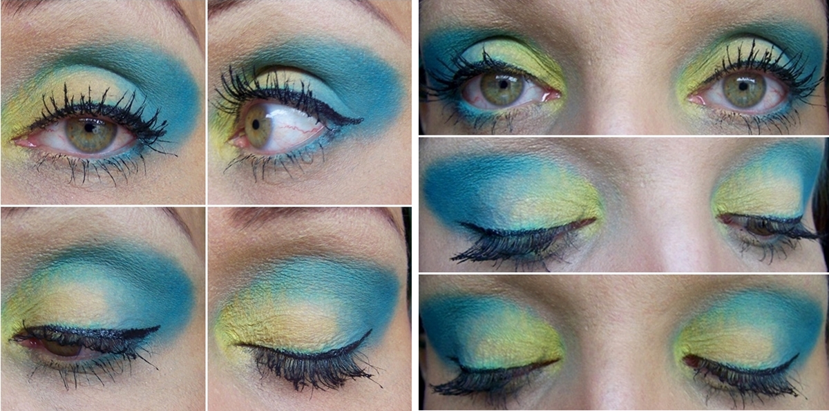 | 1. Grundierung auftragen, abpudern, Eyeshadow Base auftragen und nochmals abpudern / / 2. & 3. am Innenwinkeln auf dem beweglichen Lid den gelben Lidschatten auftragen und leicht verblenden / / 4. & 5. mit dem essence long lasting eye pencil vom äußeren Lid bis etwas über die Hälfte einen Lidstrich ziehen und ganz leicht verblenden |