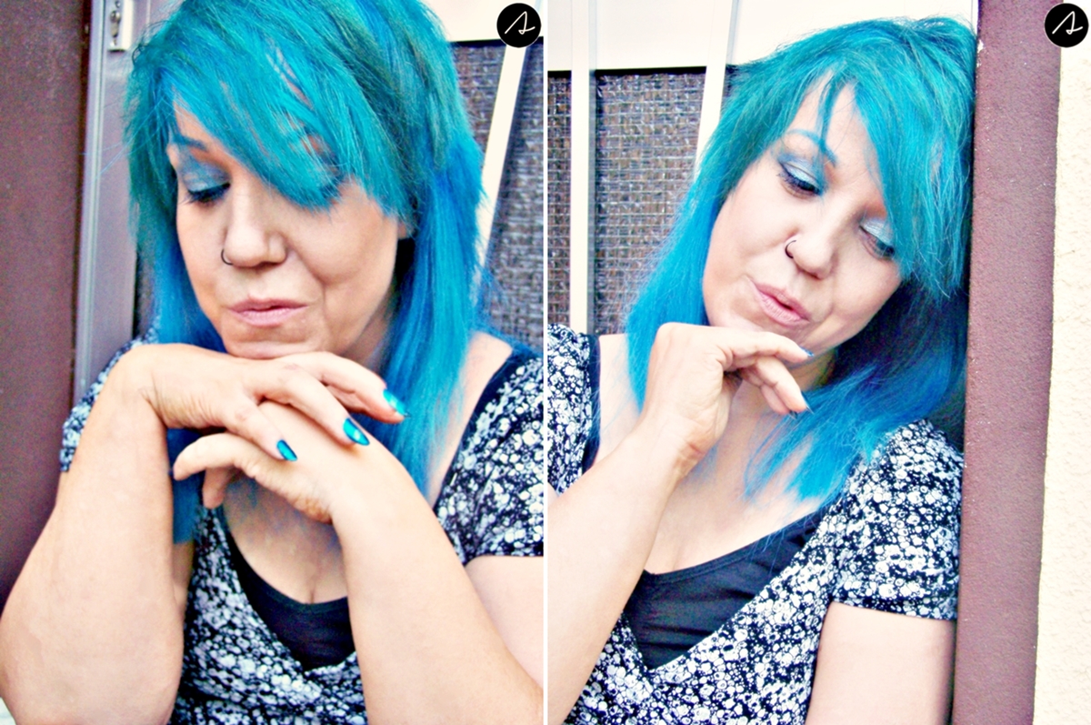 Das passt aktuell einfach toll zu meinen blauen Haaren... Blau war irgendwie schon immer meine Farbe... ich war nur immer sehr skeptisch bezüglich blau als Eyeshadow. Mir wurde immer eingeredet, das würde nicht zu meinen grünen Augen passen. Sehe ich inzwischen ganz anders, es kommt meiner Meinung nach einfach darauf an, wie es verwendet und eingesetzt wird. Mir fiel übrigens auch gleich noch eine andere Verwendung für die blauen soft touch eyeshadows ein... Zu meinen wirklich knalligen Haaren passen auch dementsprechend knallig und farbige Augenbrauen. Also warum diese nicht auch auffallend farbig betonen?!