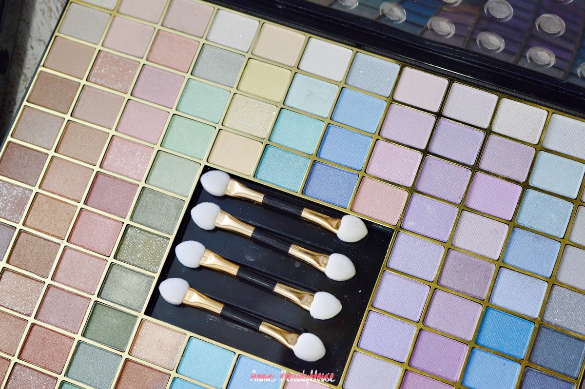 Wie gesagt, umfasst die Palette von Ruby Rose 128 Farben, sowohl matte als auch Shimmer bzw mit Glitterpartikeln. Was ich wundervoll finde, ist der Punkt, dass man eigentlich jede Farbe durch ein jeweils kleines 'Bullauge' im Deckel der Palette schon im geschlossenen Zustand der Palette sehen kann, jedenfalls dass man erahnen kann um welchen farbton es sich handelt. Das hatte ich bisher bei keiner Palette in der Größenordnung. Gut, davon hatte ich bis dato auch erst zwei Stück. Und zwar von bhCosmetics.