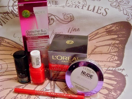 Von REVITAL aus der Laser x3-Serie die Creme - für Tag und/oder Nacht... dazu von Garnier den Optischen 5sek Retuschierer (...fühlt sich ja sooo toll an auf der Haut), ebenfalls von L'Oreal - den Nude Magique BB Powder Blemish Palm - 5 in 1 -- universeller Teint Perfektionierer... , von Catrice einen knallroten Lipliner. den essie Lack 'too too hot' - N° 63 und von essence den Better than gel nails Top Sealer.